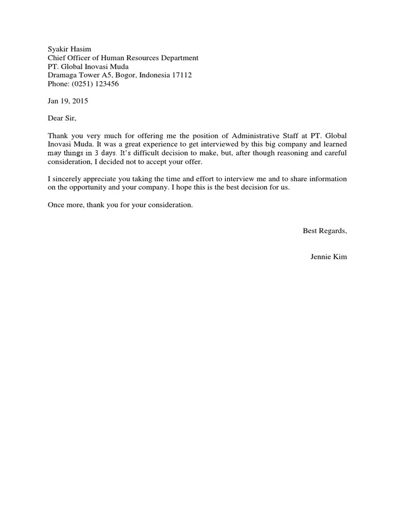I hereby thank you for job offering in your company. Contoh surat menolak tawaran kerja yang baik dan sopan dalam bahasa inggris sebagai referensi pembuatan surat yang dapat diunduh secara gratis dan lengkap. Anda tidak memiliki email perusahaan.
